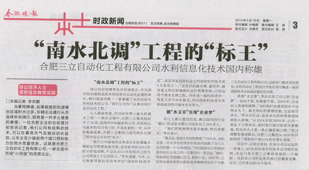 5月19日,《合肥晚報》在顯著版面以《“南水北調(diào)”工程的“標王”》為題詳細報道了此次采訪過程;《合肥日報》、《江淮晨報》也在顯著版面給予了報道。