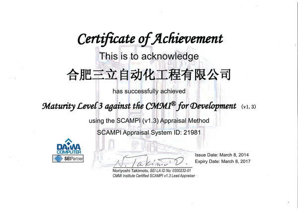 3月3日~3月8日,美國SEI評估機構(gòu)CMMI主任評估師Norishi Takimoto一行來我公司進行CMMI體系評估。經(jīng)過文檔審查、項目經(jīng)理訪談、EPG小組人員訪談等各個環(huán)節(jié),我公司順利通過CMMI 3級評估認(rèn)證,并于3月8日上午由評估小組現(xiàn)場頒發(fā)CMMI 3級認(rèn)證證書。