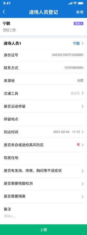 為保障工程進度和返城復(fù)工人員生命財產(chǎn)安全,本次全新升級人員報到功能,包括支持人員信息上報關(guān)聯(lián)途徑中高風(fēng)險地區(qū)、核酸檢測報告。另外考慮到復(fù)工人員素質(zhì)高低不一,支持專職人員進行逐一、合并信息代為報到。