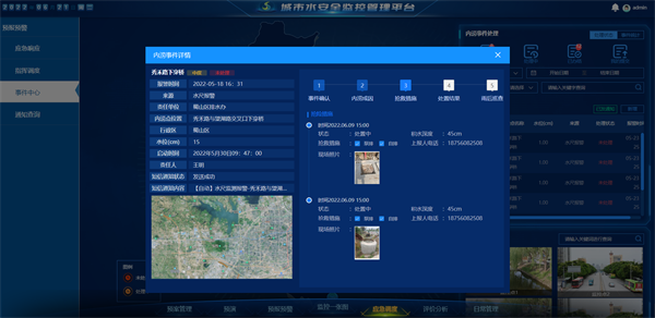 指揮人員既可掌控積澇點布防情況、應急物資、周邊避難所、內(nèi)澇事件分布等全局信息,又可實時跟蹤重點難點事件處置情況,及時下發(fā)決策指令,保證救援搶險工作有條不紊進行。