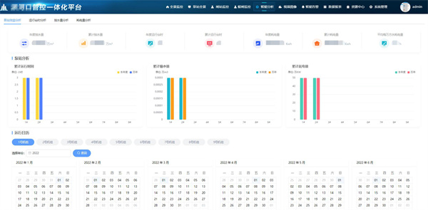 通過運行效益分析,直觀展示泵站、船閘的效益情況,主要包括平均每平方水耗電量、抽水量、運行臺時、耗電量、棄水量等概覽信息,以及歷史分析信息和運行日程信息,為泵站/船閘經(jīng)濟運行提供參考依據(jù)。