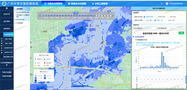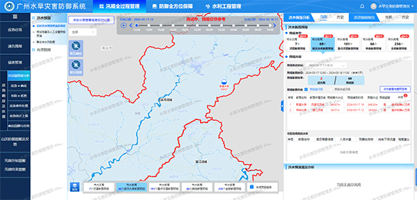 對廣州市白坭河、流溪河、增江流域1大12中水庫及9座攔河壩,開展未來24小時工程調(diào)度推演,對工程調(diào)度水位、流量防洪安全限制及調(diào)度提供參考建議,為科學(xué)調(diào)度、降低下游洪水風(fēng)險提供參考;對廣州市白坭河、流溪河、增江3大流域,實(shí)現(xiàn)未來24小時流域潛在洪水風(fēng)險仿真預(yù)演,提供洪水淹沒范圍、淹沒深度和淹沒過程等直觀洪水災(zāi)害信息,為應(yīng)急人員調(diào)度和居民緊急轉(zhuǎn)移等應(yīng)急方案制定提供依據(jù)。