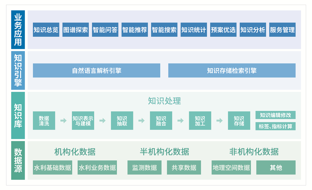 水利知識平臺通過匯聚整編各類水利基礎(chǔ)數(shù)據(jù)和水利業(yè)務(wù)資料,基于自然語言解析、機器學(xué)習(xí)、深度學(xué)習(xí)等人工智能算法模型構(gòu)建知識引擎,通過開發(fā)知識平臺對知識庫和知識引擎進行統(tǒng)一管理,提供知識檢索、知識推薦、知識分析等知識服務(wù)功能,通過統(tǒng)一的服務(wù)接口支撐水利業(yè)務(wù)應(yīng)用。水利知識平臺作為一個基礎(chǔ)技術(shù)平臺,通過自然語言處理(NLP)和機器學(xué)習(xí)技術(shù)構(gòu)建水利領(lǐng)域知識體系,采用知識圖譜與RAG知識庫雙軌架構(gòu),以知識服務(wù)的形式對平臺功能進行統(tǒng)一管理,對外提供穩(wěn)定、可靠的知識服務(wù),后續(xù)水利知識平臺將持續(xù)精細化落地應(yīng)用場景。