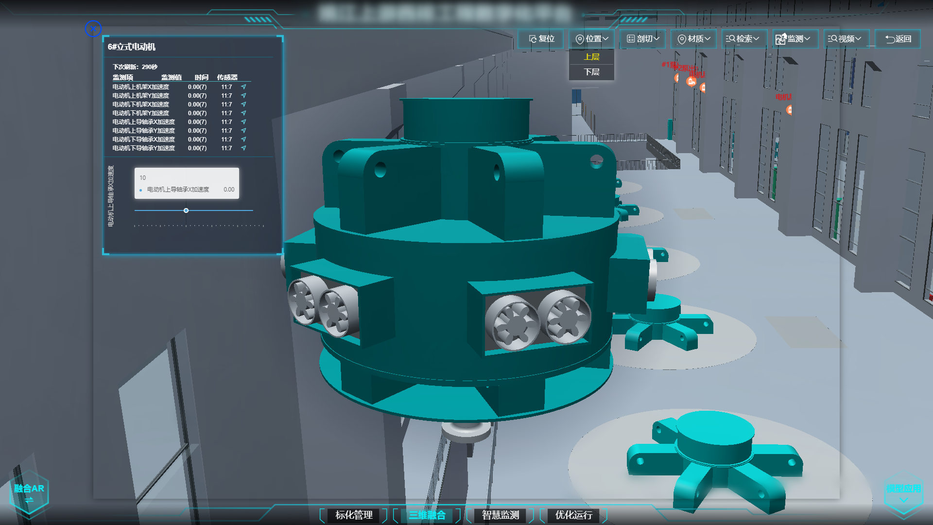 該平臺(tái)在三維GIS大場(chǎng)景下,將與水利工程運(yùn)行管理相關(guān)的監(jiān)測(cè)監(jiān)控、運(yùn)行狀態(tài)、預(yù)警報(bào)警、健康狀態(tài)等信息按照真實(shí)的點(diǎn)位布置到三維模擬場(chǎng)景中,工程運(yùn)管人員可通過(guò)三維模型實(shí)時(shí)監(jiān)測(cè)設(shè)備運(yùn)行狀態(tài),并能鏈接至對(duì)應(yīng)子系統(tǒng)查看詳細(xì)情況。對(duì)于預(yù)警或異常信息的提醒,平臺(tái)設(shè)置精準(zhǔn)定位功能,工程運(yùn)管人員能夠從問(wèn)題出發(fā),瞬間定位到信息所涉及的三維空間,聚焦問(wèn)題部件,從而真正實(shí)現(xiàn)對(duì)工程精細(xì)化、多層次相結(jié)合的高效管理。